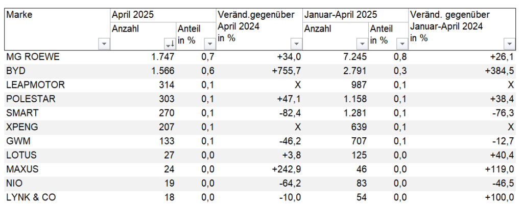 - Leapmotor (unterstützt von Stellantis) meldete 314 Fahrzeuge, ein Rückgang von 5,4 % gegenüber 332 Einheiten im März. Im Vorjahr gab es keine Zulassungen, da Leapmotor erst im November 2024 ernsthaft in Deutschland startete.